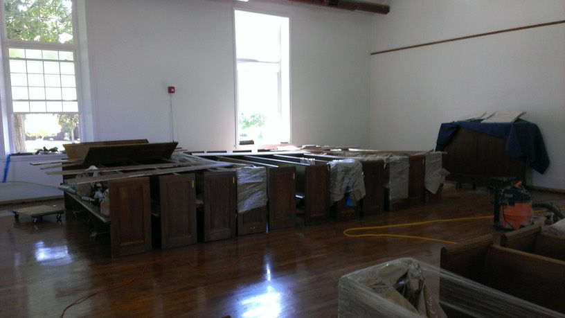 Below you see several photos taken on July 4, 2014, showing the beautiful varnished hardwood floor and our pews that we had kept in storage for several years.
